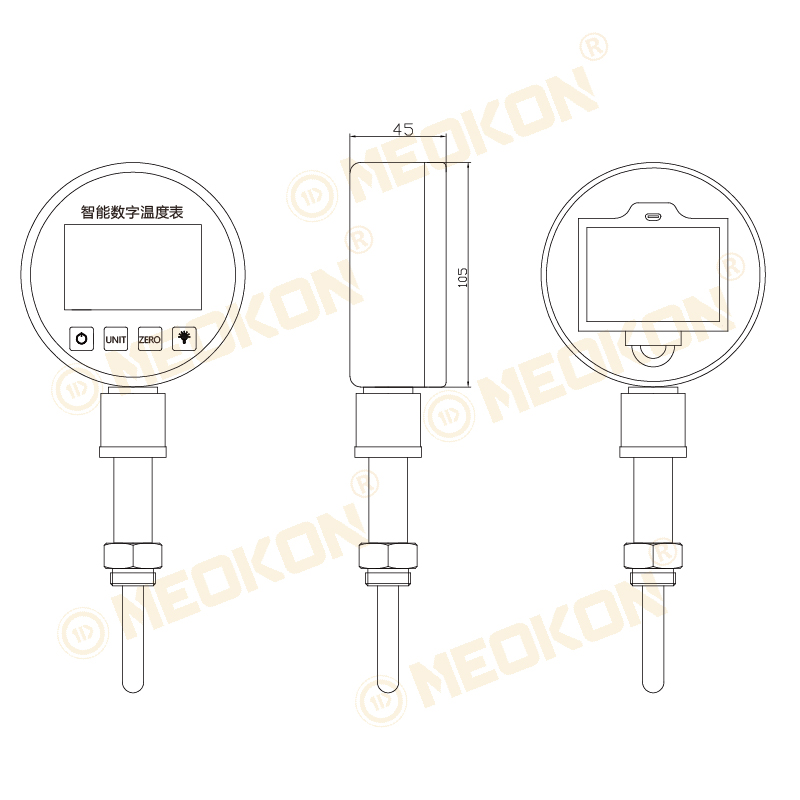100mm超大表盤,55x55mm超大液晶5位顯示,溫度精度高,低電報(bào)警、單位切換等多種輔助功能,探頭長(zhǎng)度及螺紋,溫度量程可定制